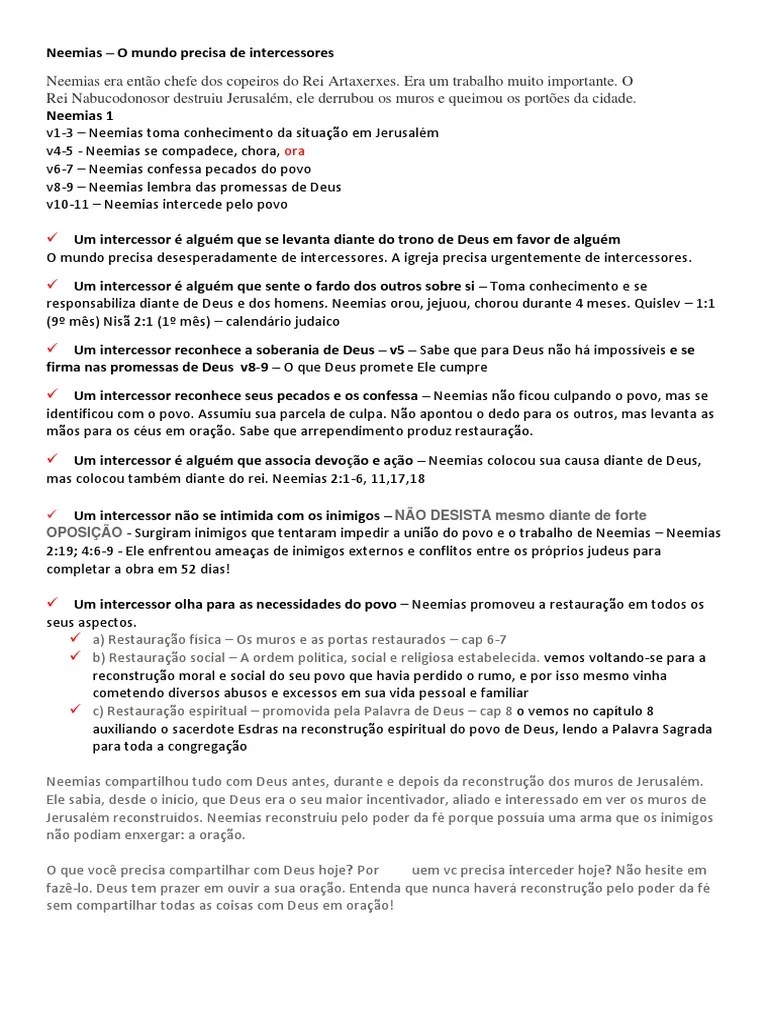 Esta oração dos levitas é uma síntese da história do povo de israel, desde sua origem com a eleição de abraão até a restauração dos muros de jerusalém... 22/04/2015 · neemias chorou, o que é uma reação natural, mas não se deixou tomar pelo desespero, nem pelo pavor. Na igreja não é diferente.. O mundo moderno requer líderes que mediante estratégias e planejamentos coerentes e adequados façam com que as coisas aconteçam.